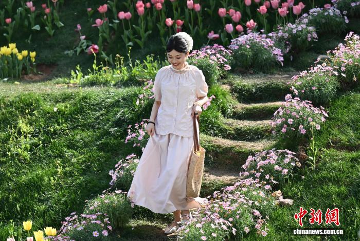 3月10日,搭客信步繁花中。中新社记者 王刚刚 摄