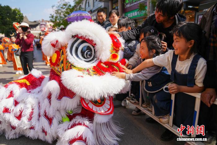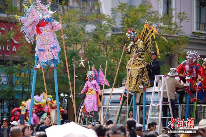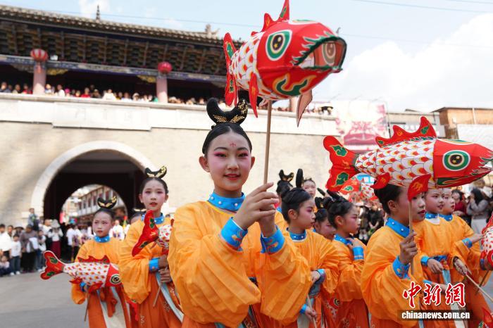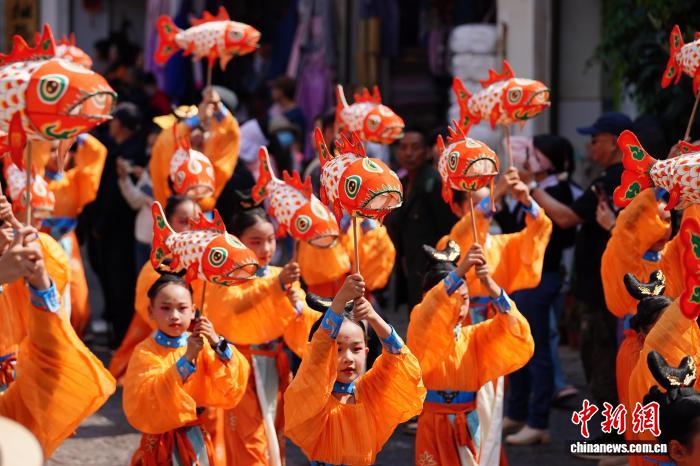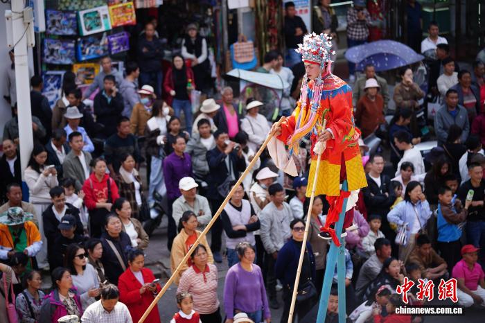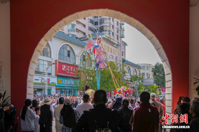 2月18日年夜岁首年月两,云北省石屏县举办古板风气巡演,为公众献上富裕中央特质的秋节风气文明衰宴。中新社记者 刘冉阳 摄
