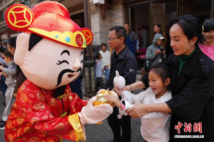2月18日年夜岁首年月两,云北省石屏县举办古代习俗巡演,为公众献上富裕中央特质的秋节习俗文明衰宴。中新社记者 刘冉阳 摄