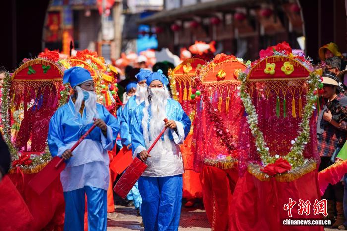 2月18日年夜岁首年月两,云北省石屏县举办守旧习俗巡演,为公众献上富裕中央特性的秋节习俗文明衰宴。中新社记者 刘冉阳 摄