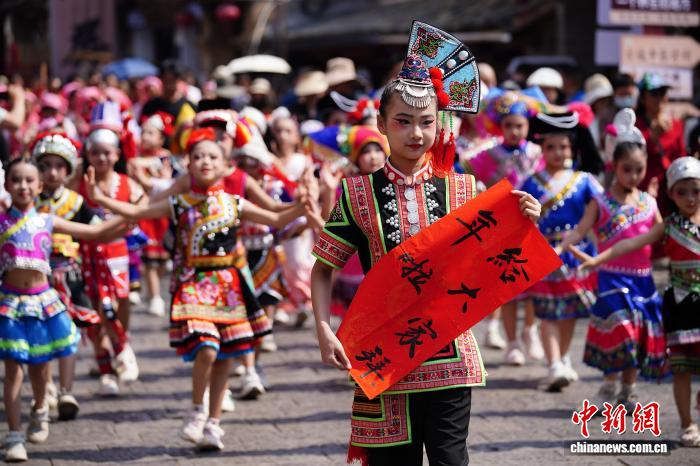 2月18日年夜岁首年月两,云北省石屏县举办守旧习惯巡演,为公众献上宽裕中央特征的秋节习惯文明衰宴。中新社记者 刘冉阳 摄